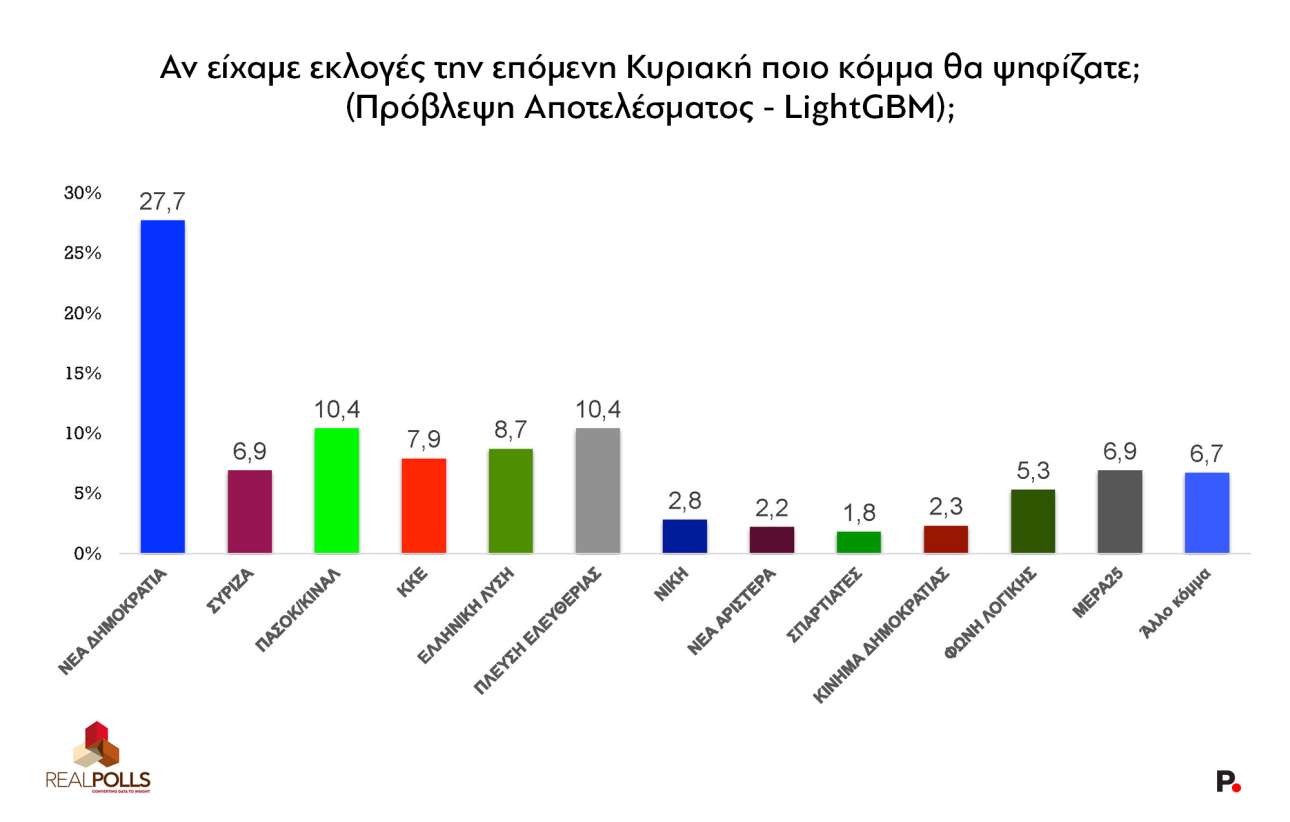 Στην πρόθεση ψήφου (Πίνακας Ι), η Νέα Δημοκρατία παρέμεινε σταθερή σε σχέση με τη μέτρηση του Σεπτεμβρίου, στο 23,8%, αλλά με μια μικρή κάμψη στην πρόβλεψη του εκλογικού αποτελέσματος (Πίνακας ΙΙ): στο 27,7%, από 27,9% τον Σεπτέμβριο και από 29,4% τον περασμένο Ιούλιο. Το 27,7% είναι κάτω από την εκλογική επίδοση της ΝΔ στις ευρωεκλογές τον Ιούνιο του 2024 (28,31%).