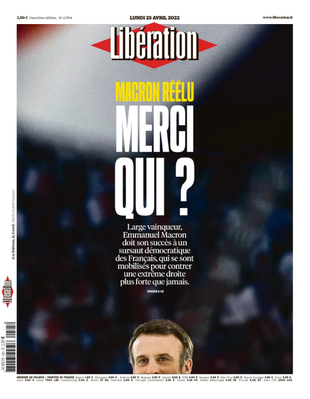 Ο Μακρόν πέτυχε μια ιστορική επανεκλογή στο Μέγαρο των Ηλυσίων όπου θα μείνει ως το 2027. Πού το οφείλει; Στα αστικά κέντρα, στους μεγαλύτερους σε ηλικία ψηφοφόρους, τη γενιά του Μάη του ’68 όπως παρατήρησαν αναλυτές. Η Libération το είπε με το πρωτοσέλιδό της τη Δευτέρα: Ο Μακρόν οφείλει τη μεγάλη νίκη του σε ένα δημοκρατικό κύμα των Γάλλων που κινητοποιήθηκαν για να αντιπαρατεθούν σε μια Ακροδεξιά πιο ισχυρή από ποτέ…