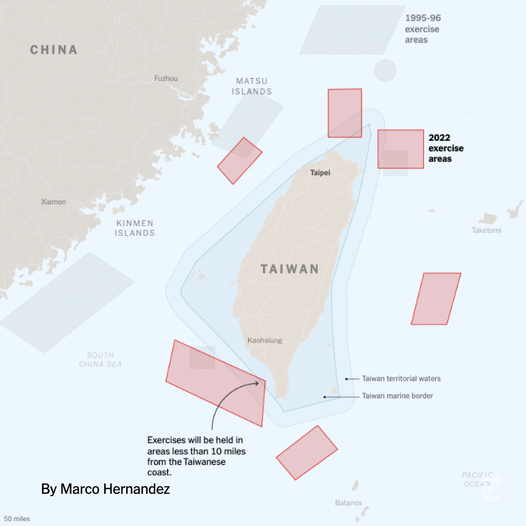 Επεξηγηματικός είναι ο χάρτης που δημοσίευσαν οι New York Times, περιγράφοντας με ροζ χρώμα τους χώρους των ασκήσεων της Κίνας πολύ κοντά στην Ταϊβάν.