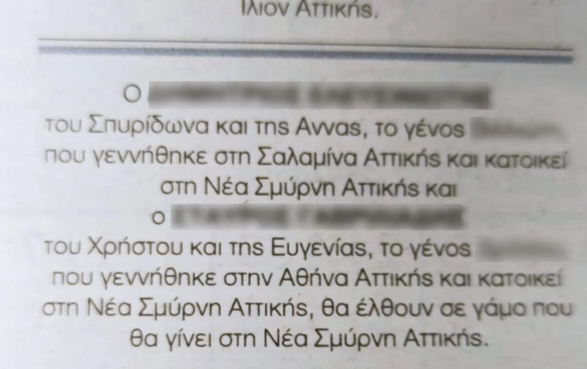 Πρόκειται για δύο άνδρες, τον Δ.Ε. και τον Στ. Γ. που κατοικούν στη Νέα Σμύρνη –όπου και θα γίνει ο γάμος.