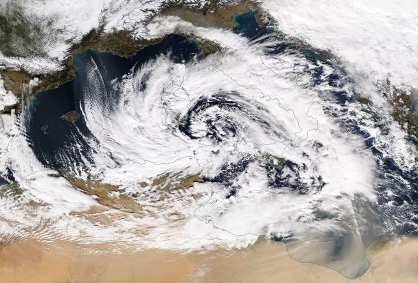 Η δορυφορική φωτογραφία της NASA για τα συστήματα που έχουν αναπτυχθεί πάνω από την κεντρική Μεσόγειο εξηγεί και το φαινόμενο της μεταφοράς της αφρικανικής σκόνης.