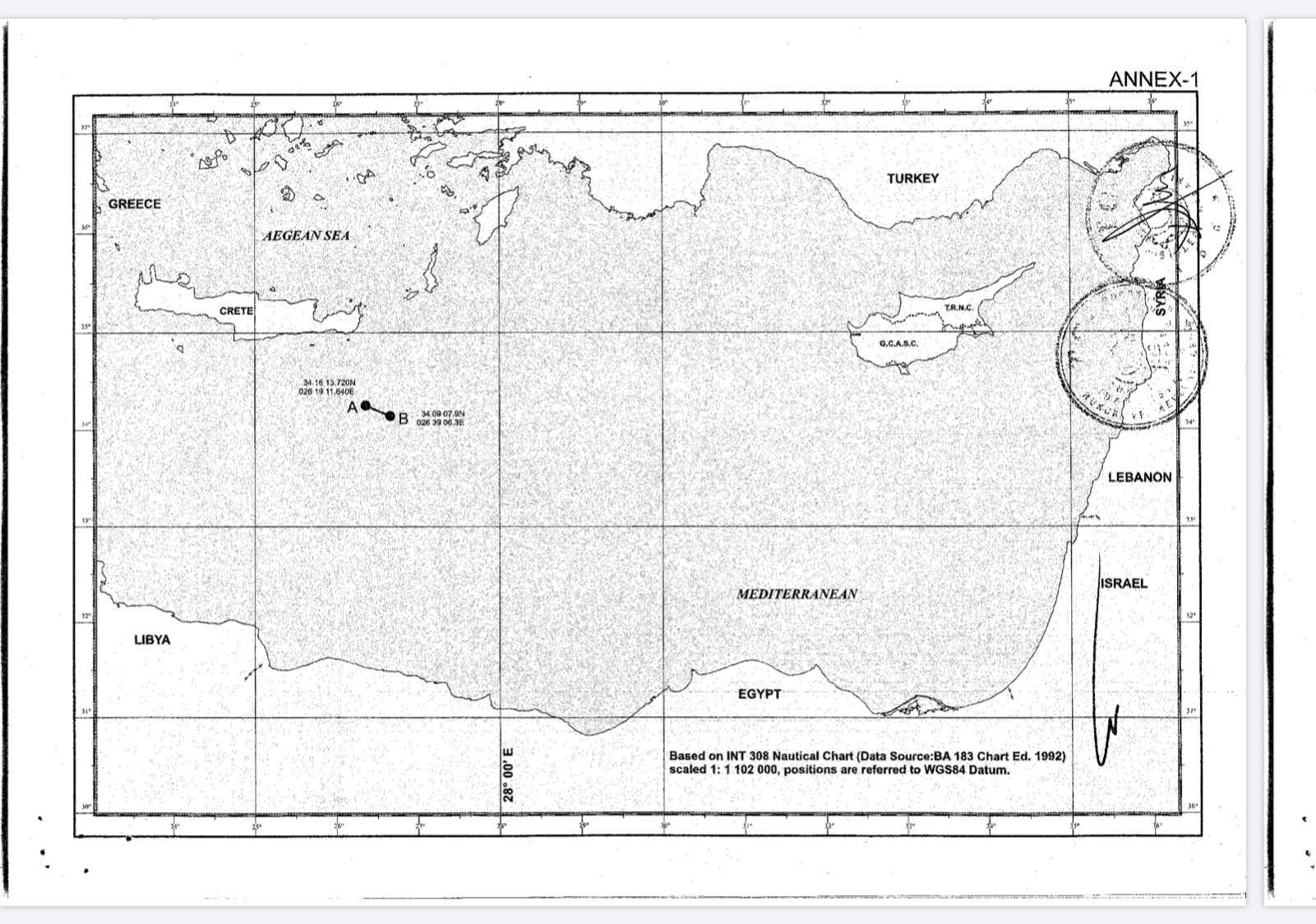 Στο άρθρο 1 περιγράφονται οι συντεταγμένες που καθορίζουν τα όρια της υφαλοκρηπίδας και της ΑΟΖ.