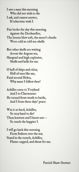 Λίγο πιο κάτω, ο πίνακας του Νόρμαν Γουίλκινσον «Troops landing on C Beach, Suvla Bay» (για τα στρατεύματα που, το 1915, αποβιβάζονταν στην Καλλίπολη, το σημερινό τουρκικό Γκελίμπολου, πολύ κοντά στην αρχαία Τροία) συνδέεται με το χειρόγραφο του ποιήματος του Πάτρικ Σο-Στιούαρτ «I saw a man this morning», που απευθύνεται στον ήρωα Αχιλλέα (κάτω αριστερά).