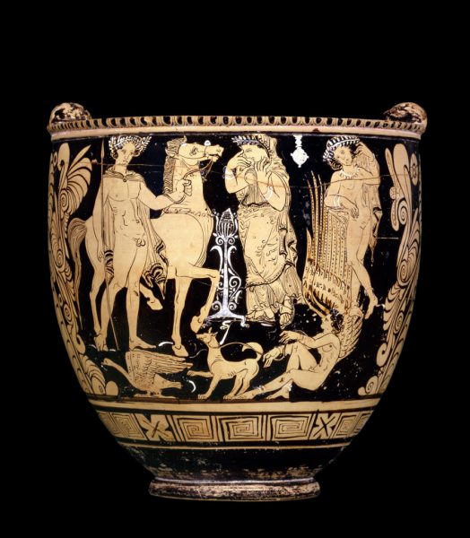 Πάντα σύμφωνα με νεότερες έρευνες, την Ελένη, στα 12 της, επιχείρησε να την κλέψει ο πρώτος της ξάδερφος, Εναρφόρος. Όμως, τελικά την έκλεψε και την έφερε στην κλίνη του ο 50χρονος χήρος τότε ημίθεος βασιλιάς Θησέας, που ήθελε να τεκνοποιήσει με κόρη θεών. Κάπως έτσι η Ελένη υπήρξε η αιτία για έναν ακόμη πόλεμο, πολύ πριν τον Τρωικό. Τα αδέρφια βούτηξαν την Αττική στο αίμα για να την πάρουν πίσω. Εκείνη, τελικά γέννησε στο Άργος το πρώτο της παιδί, που το έδωσε στην αδελφή της, Κλυταιμνήστρα, για να το μεγαλώσει στις Μυκήνες, κατά τον Ησίοδο. Και το όνομα αυτού: Ιφιγένεια. Ναι, η θυσιασμένη υπέρ ούριων ανέμων από τον θετό της πατέρα Αγαμέμνονα, όταν ξεκινούσε για την εκστρατεία στην Τροία. Μάρτυρας και η θυσία της στο αγγείο του 370 – 355 π.Χ. στην έκθεση «Τροία».