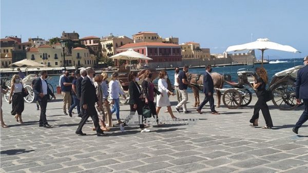 Το πρόγραμμα συνεχίστηκε με μία χαλαρή βόλτα στο Ενετικό Λιμάνι των Χανίων, συνοδεία της υπουργού Πολιτισμού, Λίνας Μενδώνη, αλλά και της μεγαλύτερης κόρης του πρωθυπουργικού ζεύγους, Σοφίας Μητσοτάκη.