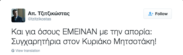 20:50 To tweet του Απόστολου Τζιτζικώστα δίνει συγχαρητήρια στον νέο πρόεδρο της ΝΔ, χωρίς να λέει ποιος είναι αυτός.