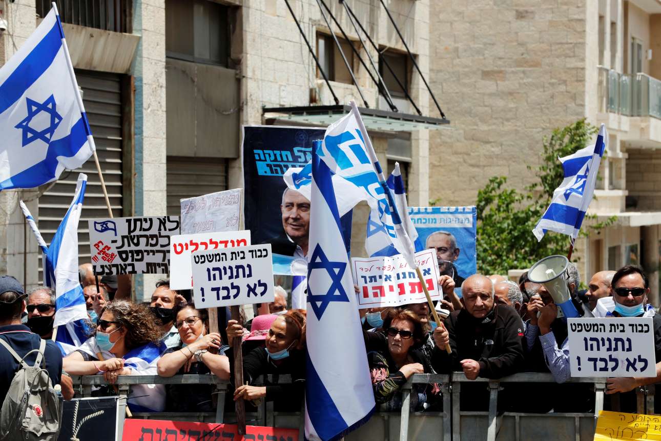 Εξω από το δικαστήριο, υπήρχαν συγκεντρωμένοι τόσο υποστηρικτές του όσο και αντίπαλοί του, με πανό και ισραηλινές σημαίες.