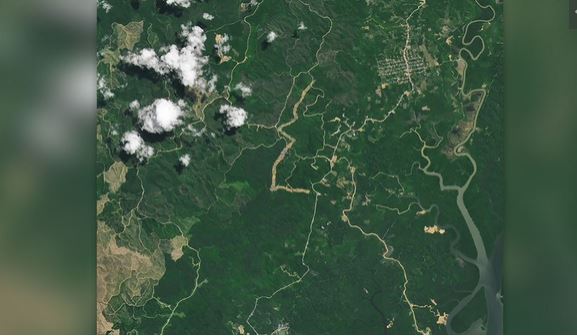 Οι δορυφορικές λήψεις από τον Απρίλιο του 2022 και τον Φεβρουάριο του 2024 δείχνουν ένα δίκτυο νέων δρόμων και την κατασκευή κτιρίων στο ανατολικό Καλιμαντάν, όπου οικοδομείται η Νουσαντάρα.