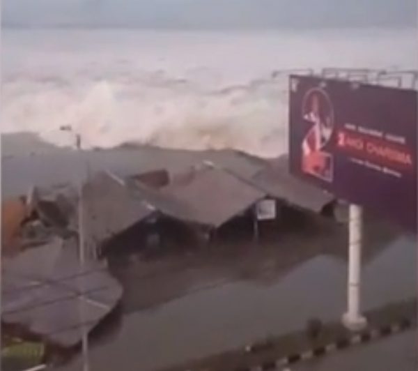Η ινδονησιακή τηλεόραση δείχνει βίντεο με ένα ισχυρό κύμα που χτυπάει την Παλού, με ανθρώπους να ουρλιάζουν και να σπεύδουν να απομακρυνθούν.