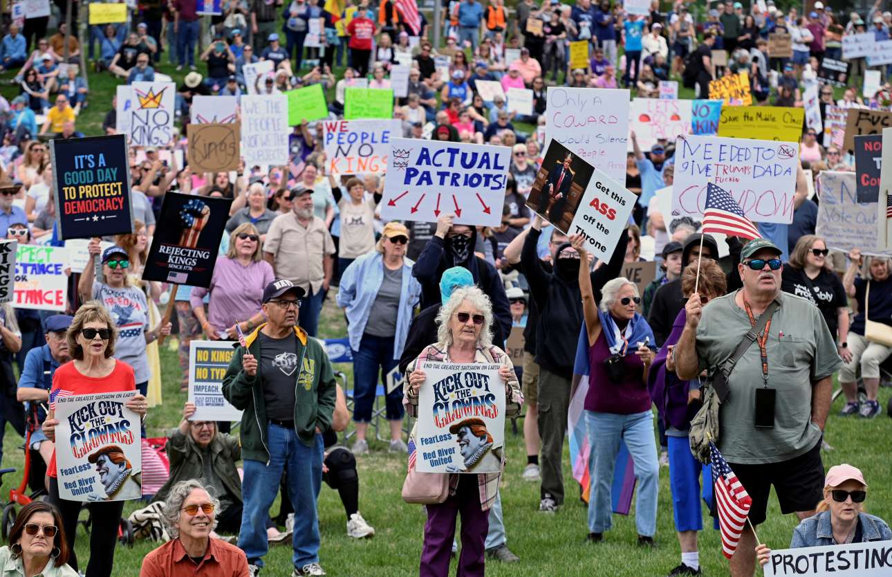 Εκατομμύρια Αμερικανοί διαδήλωσαν σε όλη τη χώρα το Σάββατο, στην ημέρα «κατά του βασιλιά», αντιδρώντας σθεναρά στον διευρυνόμενο αυταρχισμό του Ντόναλντ Τραμπ, στις επιθέσεις κατά μεταναστών και στις βαθιές περικοπές σε εκατοντάδες ομοσπονδιακά προγράμματα στο εσωτερικό και στο εξωτερικό.