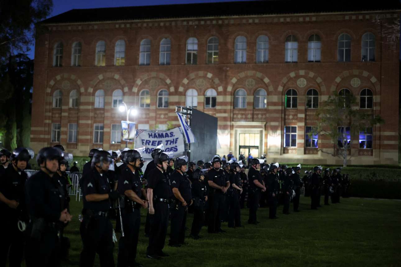 Στην πανεπιστημιούπολη του UCLA, στο Λος Άντζελες, ξέσπασαν συγκρούσεις τη νύχτα όταν μεγάλη ομάδα αντιδιαδηλωτών, πολλοί από τους οποίους είχαν καλυμμένα τα πρόσωπα με μάσκες, επιτέθηκε εναντίον καταυλισμού διαδηλωτών υπέρ των Παλαιστινίων εγκατεστημένου σε πρασιά, διαπίστωσε φωτοειδησεογράφος του Γαλλικού Πρακτορείου.