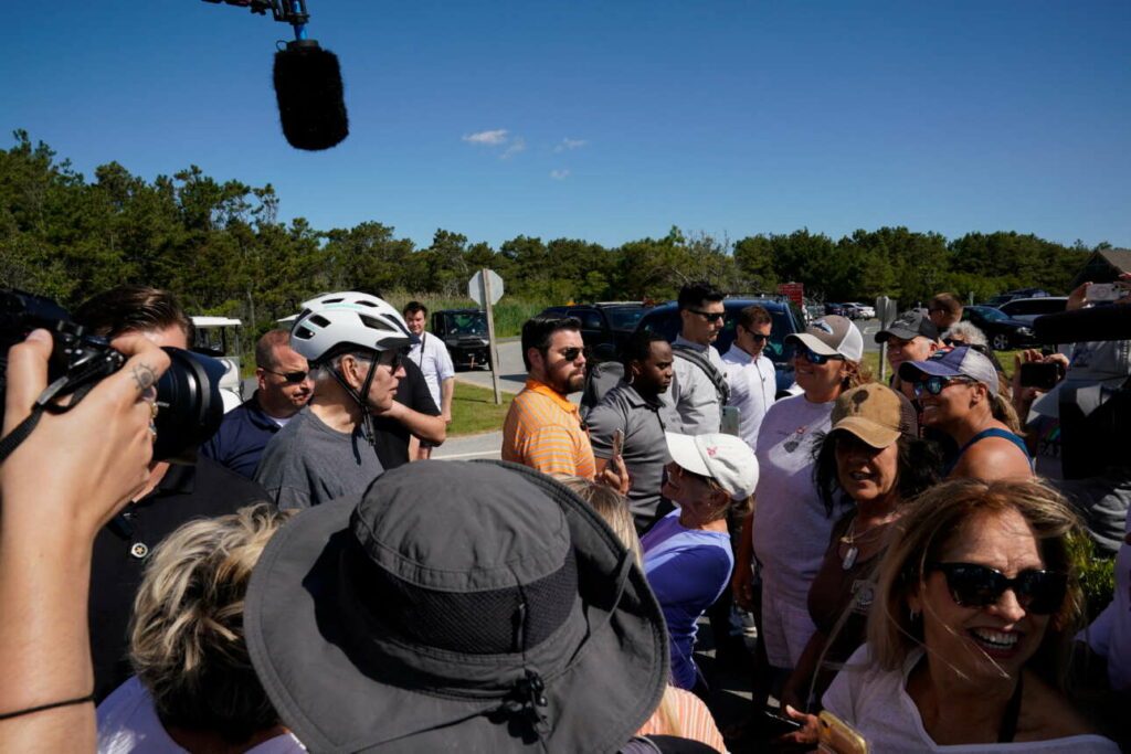 Στη συνέχεια, ο αμερικανός πρόεδρος μίλησε για περίπου 5 λεπτά με τους περαστικούς και με τους δημοσιογράφους, ανέβηκε ξανά στο ποδήλατο και έφυγε.