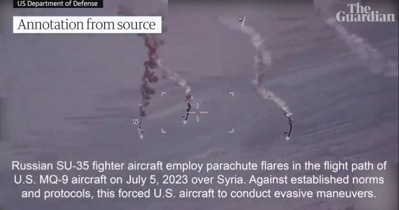 Τα ρωσικά αεροσκάφη φαίνονται να ρίχνουν φωτοβολίδες αναγκάζοντας τα τηλεκατευθυνόμενα αεροσκάφη MQ-9 Reapers να πραγματοποιούν ελιγμούς αποφυγής.