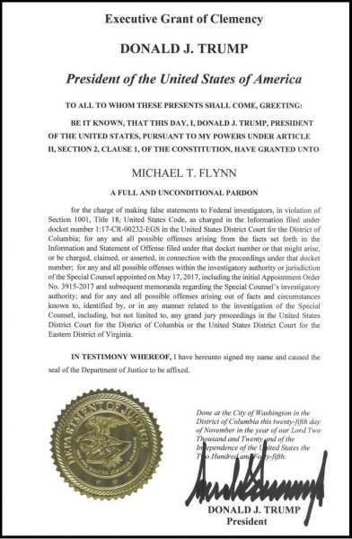 It is my Great Honor to announce that General Michael T. Flynn has been granted a Full Pardon. Congratulations to @GenFlynn and his wonderful family, I know you will now have a truly fantastic Thanksgiving!