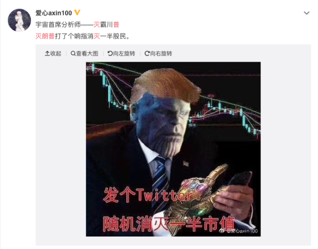 «Κουνάω τα δάχτυλά μου, αφανίζω τους μισούς από τους κινέζους επενδυτές» δήλωνε το πρωί της περασμένης Δευτέρας ένα από τα πιο δημοφιλή memes που κυκλοφόρησαν στα κινεζικά μέσα κοινωνικής δικτύωσης, απεικονίζοντας τον Τραμπ σαν άλλο Thanos, τον πλέον υπερκακό πρωταγωνιστή της σειράς ταινιών «The Avengers».