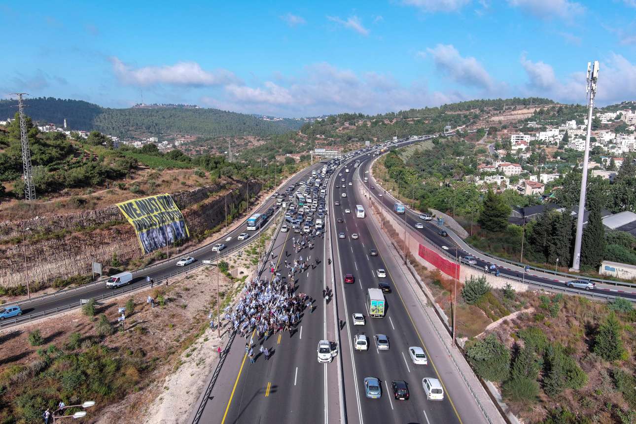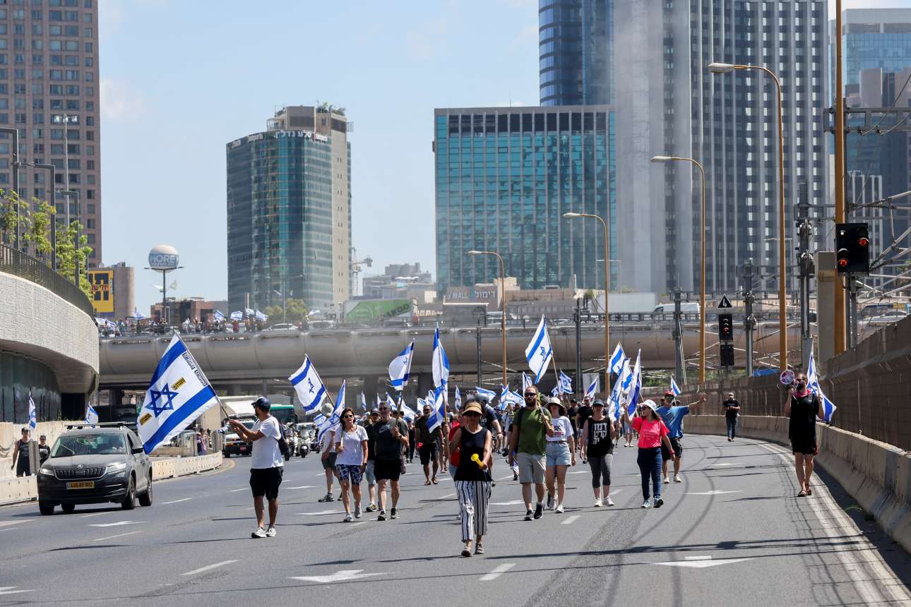 Εικόνες έδειχναν Ισραηλινούς που κρατούσαν σημαίες να σταματούν αυτοκίνητα σε μεγάλες διασταυρώσεις και οδικές αρτηρίες στο κεντρικό Ισραήλ, το Τελ Αβίβ και κοντά στην είσοδο της Ιερουσαλήμ. Κάποιοι ξάπλωσαν στο οδόστρωμα και άλλοι έριξαν φωτοβολίδες.