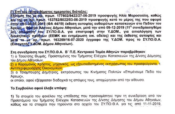 Κατά την ημέρα της συνεδρίασης 20.10.2020, στην οποία παριστάμεθα, αντικρύσαμε προς μεγάλη μας έκπληξη τον Χρ. Καραμάνο να εμφανίζεται ως “εξουσιοδοτημένος εκπρόσωπος του επιχειρηματία” (αυτό καταγράφεται και στα πρακτικά).»Τώρα τα καταλαβαίνουμε όλα, ήταν τόσο απλό αλλά εμείς είμαστε αφελείς.