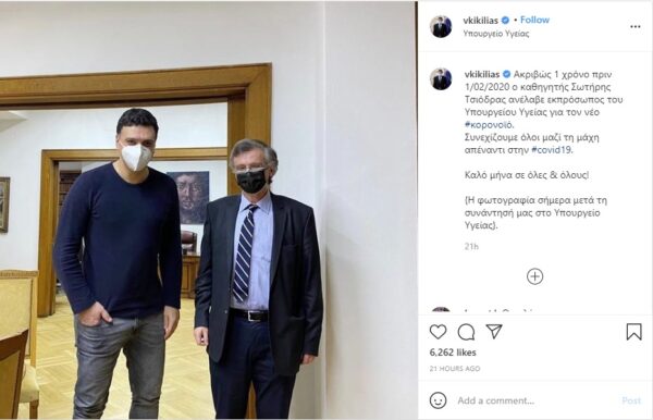Η ανάρτηση του Βασίλη Κικίλια στο Instagram είχε κάτι το χαρούμενο –ο υπουργός Υγείας και ο Σωτήρης Τσιόδρας διακρίνονται να χαμογελούν πίσω από τις μάσκες, στη συνάντηση που είχαν στο υπουργείο.