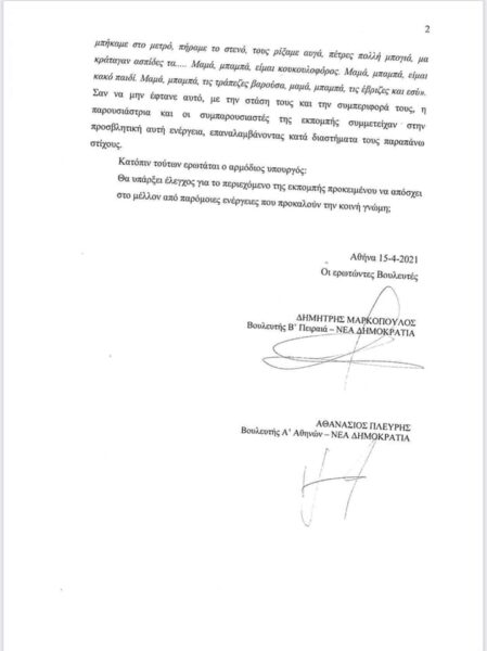 Και με ερώτησή τους προς τον υφυπουργό παρά τω Πρωθυπουργό Θοδωρή Λιβάνιο απαίτησαν να υπάρχει έλεγχος στο περιεχόμενο της συγκεκριμένης εκπομπής –της συγκεκριμένης και προς το παρόν όχι άλλης– «προκειμένου να απόσχει στο μέλλον από παρόμοιες ενέργειες που προκαλούν την κοινή γνώμη».