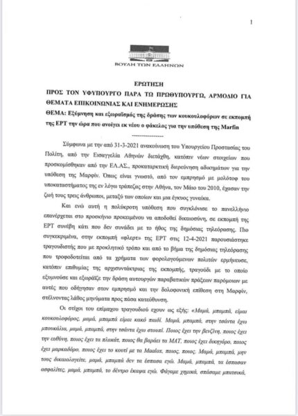 Ο κοινοβουλευτικός εκπρόσωπος της ΝΔ και ο βουλευτής Β’ Πειραιώς εξοργίστηκαν που προ ημερών στην καθημερινή εκπομπή «ΦλΕΡΤ» ο γνωστός σατιρικός μουσικός Σπύρος Γραμμένος ερμήνευσε το τραγούδι «Μαμά, μπαμπά, είμαι κουκουλοφόρος».