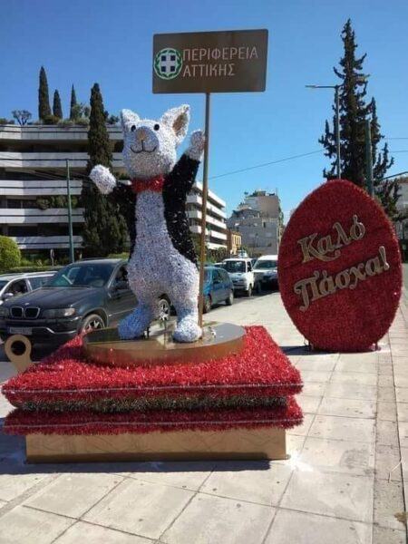 Γιγάντιοι λαγοί, ή γιγάντια κοτόπουλα. Σε διάφορες στάσεις. Στις κεντρικές οδικές αρτηρίες –ακόμα και μπροστά στο εμβληματικό Καλλιμάρμαρο. Να μας εύχονται καλό Πάσχα. Προσφορά της Περιφέρειας Αττικής και του περίφημου Γιώργου Πατούλη…