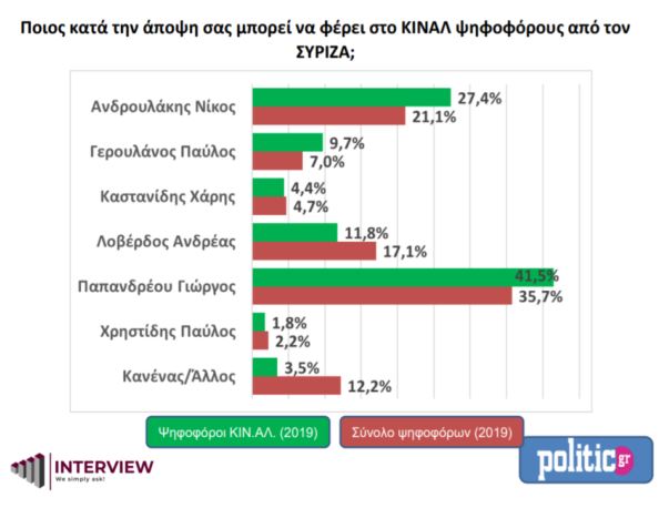 Εκλογές χωρίς δημοσκοπήσεις δεν γίνονται. Ετσι, μια εταιρεία ερευνών, η Interview, έψαξε και βρήκε ψηφοφόρους του Κινήματος Αλλαγής. Και αφού τους βρήκε –πράγμα όχι και τόσο εύκολο– τους ρώτησε ποιον θέλουν για νέο αρχηγό του κόμματος.