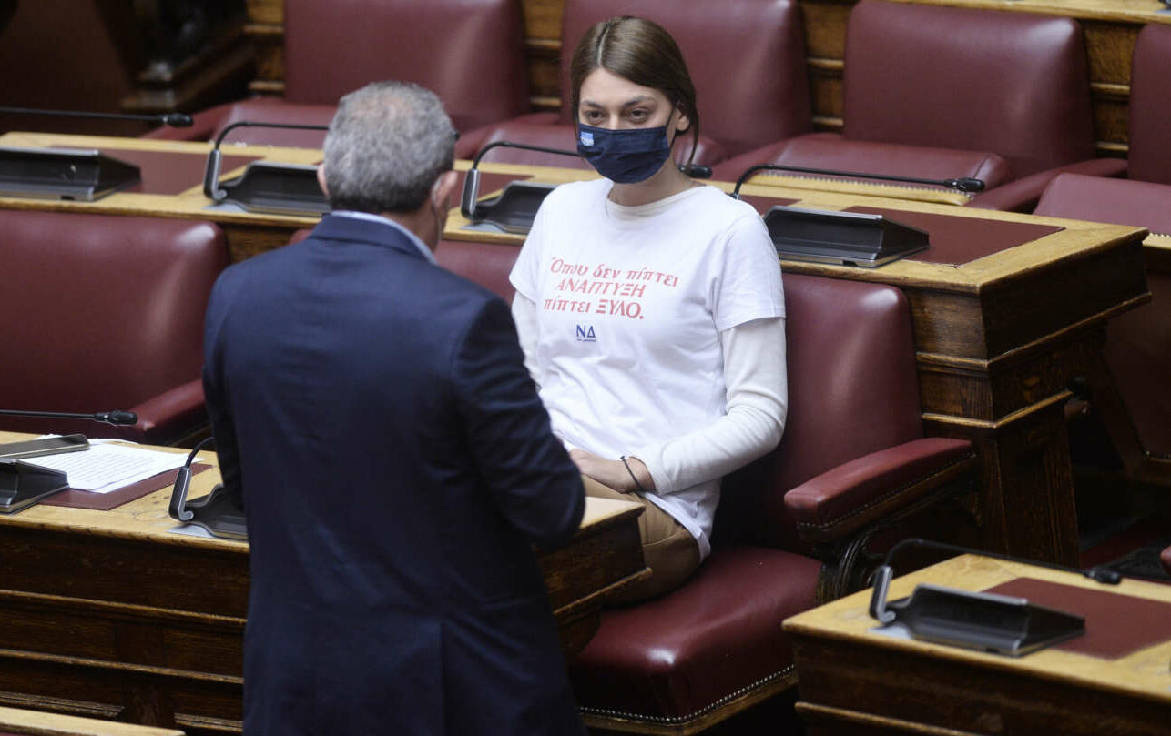 Η Απατζίδη του ΜέΡΑ25 εμφανίστηκε με μπλουζάκι στη Βουλή: «Οπου δεν πίπτει ανάπτυξη, πίπτει ξύλο - ΝΔ»