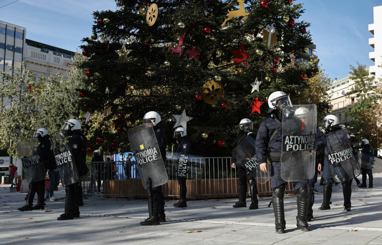 Σουρεάλ γιορτινή Αθήνα: Ανδρες των ΜΑΤ έχουν περικυκλώσει το έλατο στο Σύνταγμα για να μην καεί