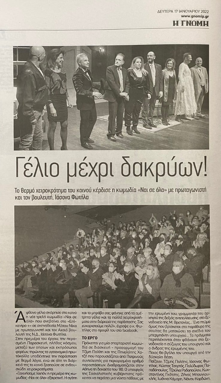 Ο κ. Φωτήλας, λοιπόν, ανέβηκε στο θεατρικό σανίδι και πρωταγωνίστησε στην παράσταση «Ναι σε όλα», που έκανε την πρεμιέρα της το βράδυ της Κυριακής στον χώρο «Επίκεντρο+» στην Πάτρα, σε σκηνοθεσία Μίλτου Νίκα.
