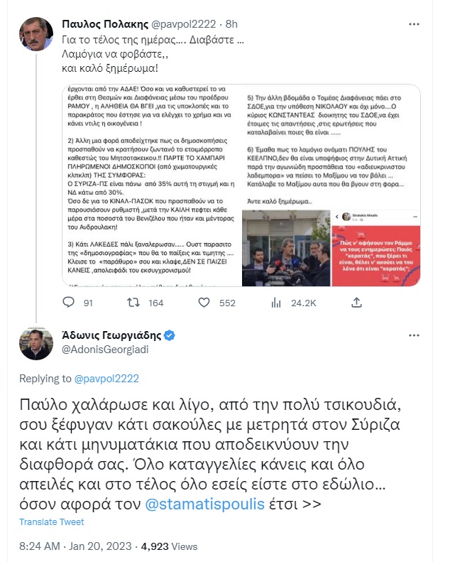 Αφορμή για τη νέα ανταλλαγή μηνυμάτων στο Twitter ήταν μια ανάρτηση του κ. Πολάκη, ο οποίος μεταξύ άλλων γλαφυρών –όπως ότι ο ΣΥΡΙΖΑ είναι στο 35% και η ΝΔ κάτω από το 30%– υποστήριξε ότι ο πολιτευτής και protegé του κ. Γεωργιάδη, Σταμάτης Πούλης, δεν θα είναι τελικά υποψήφιος με τη ΝΔ στη Δυτική Αττική.