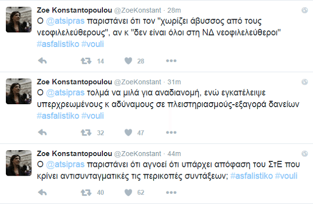 Για την Ζωή Κωνσταντοπούλου λοιπόν ο Αλέξης Τσίπρας «παριστάνει ότι αγνοεί ότι υπάρχει απόφαση του ΣτΕ που κρίνει αντισυνταγματικές τις περικοπές συντάξεων» (1o tweet), «τολμά να μιλά για αναδιανομή, ενώ εγκατέλειψε υπερχρεωμένους κ αδύναμους σε πλειστηριασμούς-εξαγορά δανείων» (2o tweet), «παριστάνει ότι τον χωρίζει άβυσσος από τους νεοφιλελεύθερους, αν και δεν είναι όλοι στη ΝΔ νεοφιλελεύθεροι» (3o tweet), «είναι εθνικός υποκριτής (σ.σ.: νέα προσφώνηση!) που ψήφισε τις περικοπές των συντάξεων μαζί με τους άλλους το καλοκαίρι με νομοτεχνική συνταγή Βενιζέλου» (4o tweet), «βρίσκεται σε νεομνημονιακή κατρακύλα γιατί δηλώνει ότι «δεν δέρνουν διαδηλωτές», αλλά και ότι «οι αγώνες είναι καλοί αρκεί να έχουν αποτέλεσμα» (5o tweet), «πανηγυρίζει ο που θα εξασφαλίσει εθνική σύνταξη 384€, δηλαδή σύνταξη υποδιπλάσια του ορίου της φτώχιας» (6o tweet), «σαν σήμερα, κατέθετε πέρισυ (sic) στεφάνι στο σκοπευτήριο της Καισαριανής και σήμερα, εκπροσωπήθηκε στο Μνημόσυνο Γρίβα στην Κύπρο» (7o tweet) και «σαν σήμερα (σ.σ.: επίσης) κατέθετε στεφάνι στο σκοπευτήριο Καισαριανής και τώρα σιωπά για τις γερμανικές οφειλές και αποκαλεί το Γλέζο ανόητο ήρωα» (8o tweet).