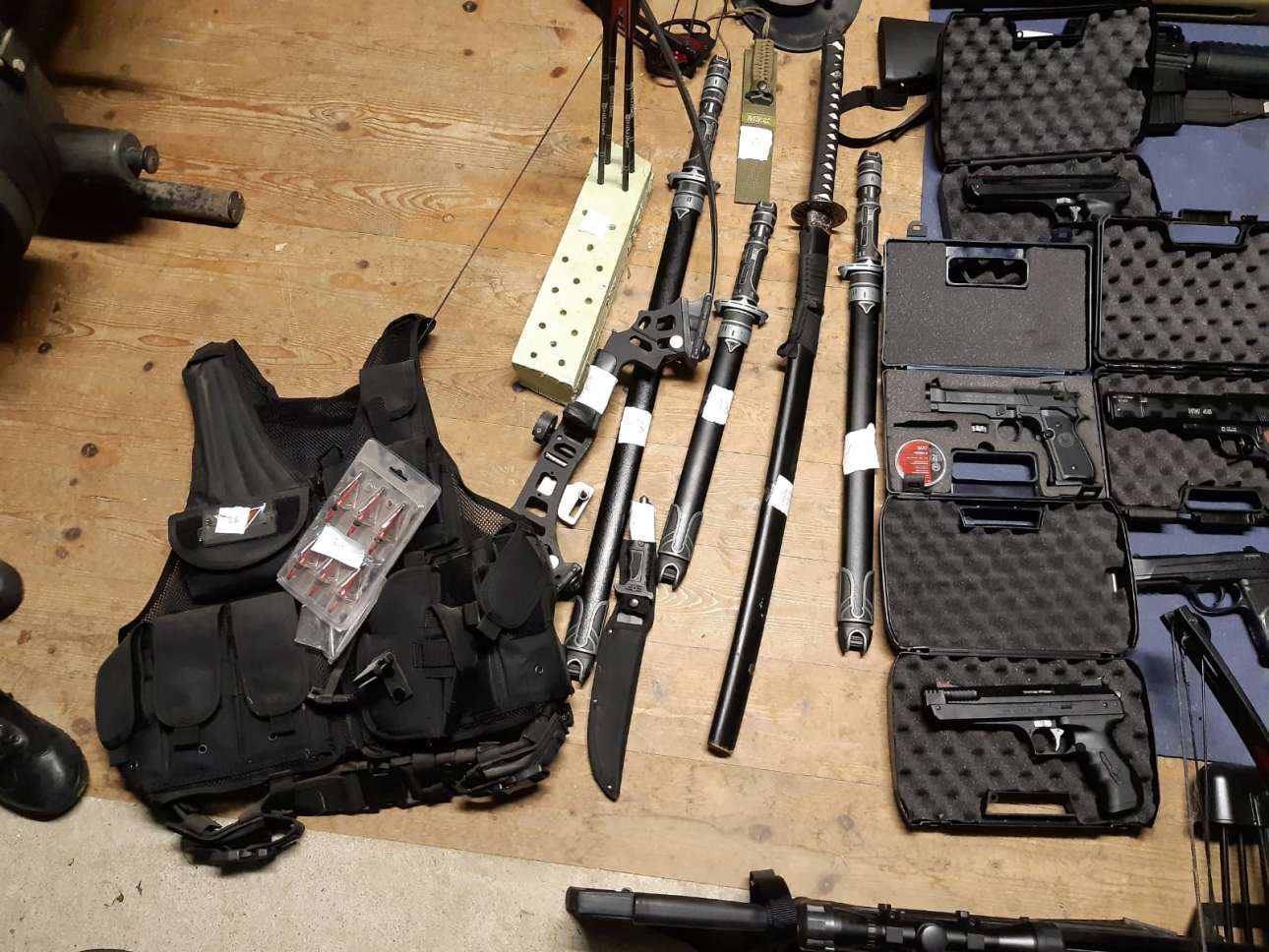 Φωτογραφίες της αστυνομίας με τα κατασχεθέντα αντικείμενα κατά τη διάρκεια των ερευνών της δείχνουν εξάλλου μεγάλη ποσότητα όπλων, όπως πιστόλια, αυτόματα όπλα ή μη, πυροβόλα, μαχαίρια, βαλλίστρες, αλλά και βιβλία για τον Μουσολίνι και τον Χίτλερ.