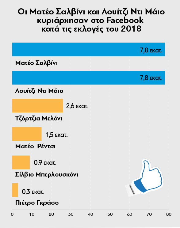 Χαρακτηριστικά, οι 25 δημοφιλέστερες αναρτήσεις, τους δύο μήνες της προεκλογικής εκστρατείας, ήταν βίντεο, «ζωντανές» συνδέσεις ή φωτογραφίες του Σαλβίνι, αντιπροέδρου της ιταλικής κυβέρνησης και ηγέτη της ακροδεξιάς Λέγκας ή του Ντι Μάιο, επίσης αντιπροέδρου της κυβέρνησης και ηγέτη του κινήματος των Πέντε Αστέρων. Ο καθένας τους συγκέντρωσε 7,8 εκατ. like σε αναρτήσεις τους, πολλές από τις οποίες αναπαρήγαγαν χιλιάδες χρήστες του μέσου. Αντίστοιχα, ο Ρέντσι, έλαβε μόλις 1,5 εκατ. like.