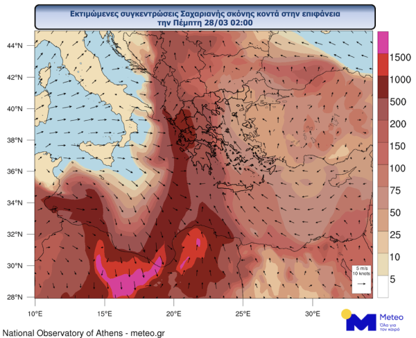 Στην παρακάτω ομάδα χαρτών του Meteo παρουσιάζονται οι συγκεντρώσεις σκόνης κοντά στην επιφάνεια στις 14:00 της Τετάρτης (27/3) και 02:00 της Πέμπτης (28/3):