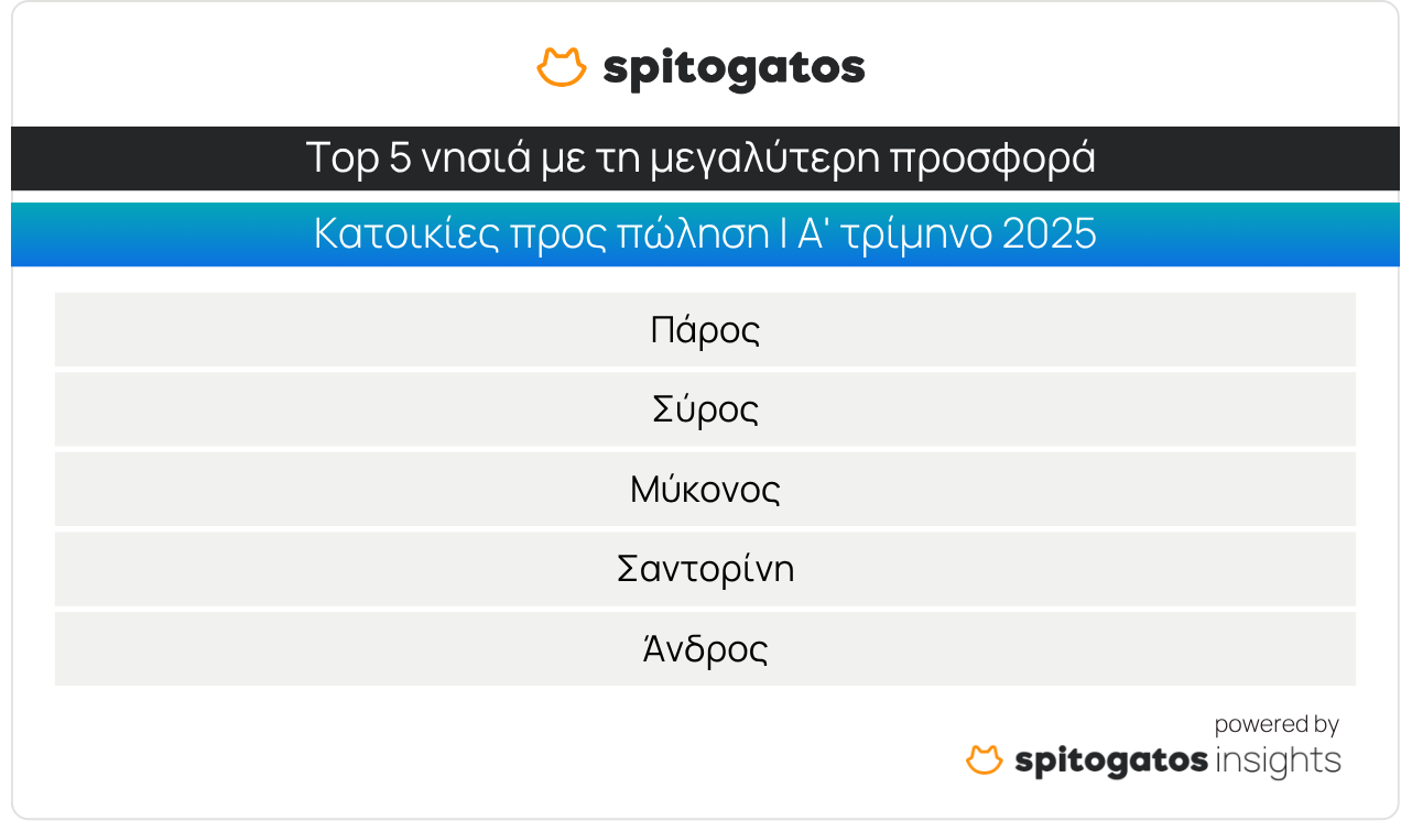 Με βάση την κατανομή της προσφοράς κατοικιών προς πώληση ανά νησί, τα πέντε νησιά με τον μεγαλύτερο αριθμό διαθέσιμων κατοικιών προς πώληση κατά το 1ο τρίμηνο του 2025 είναι η Πάρος, η Σύρος, η Μύκονος, η Σαντορίνη και η Άνδρος, όπως αποτυπώνεται και στον παρακάτω πίνακα. Ιδιαίτερο ενδιαφέρον παρουσιάζουν η Σύρος και η Άνδρος, οι οποίες, παρά τον χαμηλότερο βαθμό τουριστικής πίεσης σε σχέση με άλλα νησιά, φαίνεται να κερδίζουν έδαφος ως εναλλακτικοί προορισμοί για αγορά κατοικίας.