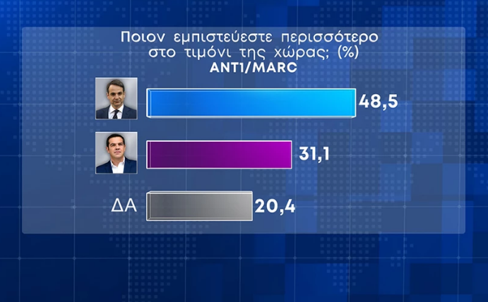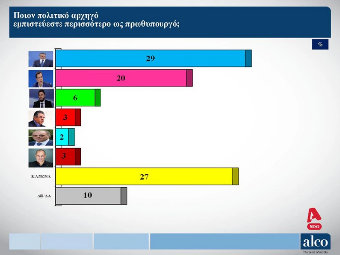 Στο ερώτημα «ποιον πολιτικό αρχηγό εμπιστεύεστε περισσότερο για Πρωθυπουργό», οι ερωτηθέντες απάντησαν: 29% τον Κυριάκο Μητσοτάκη, 20% τον Αλέξη Τσίπρα, 27% κανέναν, 6% τον Νίκος Ανδρουλάκη, 3% τον Δημήτρη Κουτσούμπα, 2% τον Κυριάκο Βελόπουλο, 3% τον Γιάννη Βαρουφάκη, 10% ΔΞ/ΔΑ.