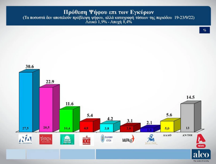 Χαμηλότερη κατά μία μονάδα ήταν η διαφορά ανάμεσα στα δύο πρώτα κόμματα (7,7 μονάδες) κατά την έρευνα της Alco, η οποία πραγματοποιήθηκε από τις 19 έως τις 23 Σεπτεμβρίου σε δείγμα 1.001 ατόμων.