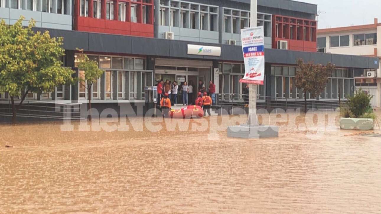 Στην οδό Ιερολοχιτών κόσμος έχει καταφύγει σε ανώτερους ορόφους κατοικιών, αφού τα ισόγεια έχουν πλημμυρίσει, και ζητά βοήθεια από την Πυροσβεστική.