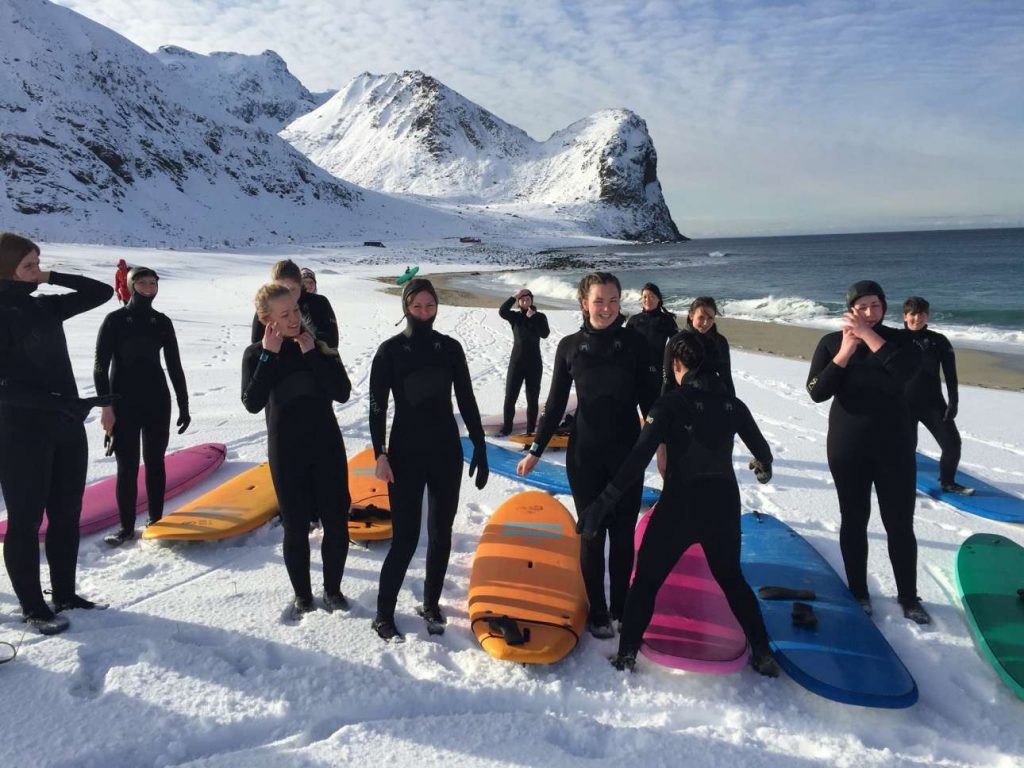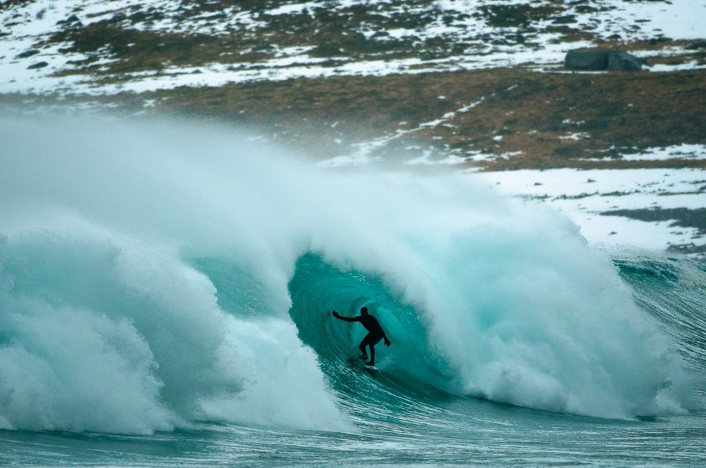 Για τον λόγο αυτόν και οι φανατικοί του σέρφινγκ φροντίζουν να φορούν την πιο ζεστή στολή τους προτού βουτήξουν στα αφιλόξενα νερά με μοναδική θέα τις χιονοσκεπείς βουνοκορφές και τα φιόρδ.