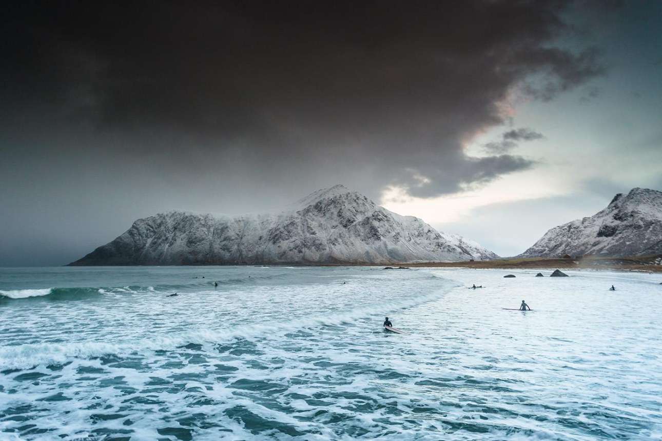 Για τον λόγο αυτόν και οι φανατικοί του σέρφινγκ φροντίζουν να φορούν την πιο ζεστή στολή τους προτού βουτήξουν στα αφιλόξενα νερά με μοναδική θέα τις χιονοσκεπείς βουνοκορφές και τα φιόρδ.