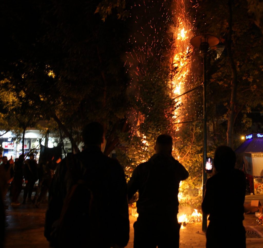 Ανενόχλητοι συγκεντρώθηκαν γύρω στις 21.00 και άναψαν το δέντρο με αναπτήρα, βγάζοντας φωτογραφίες και βιντεοσκοπώντας το «κατόρθωμά» τους.