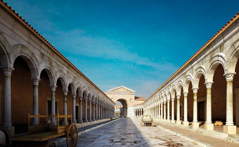Ο οδικός άξονας είναι στρωμένος με μαρμάρινες πλάκες και βρίσκεται κάτω από εντυπωσιακό τετράπυλο με πλατεία, δημόσιο κτίριο και μαγαζιά.