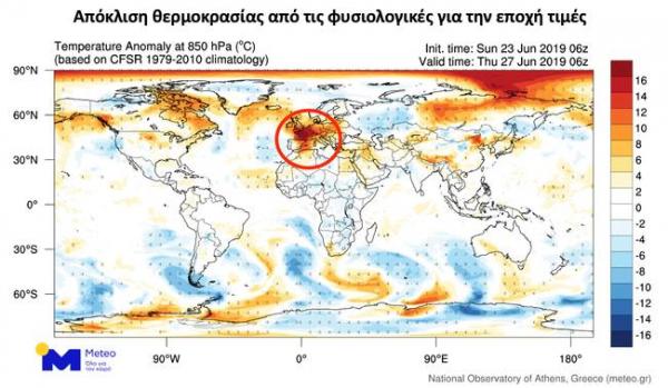 Ο παρακάτω χάρτης δείχνει την πρόγνωση της θερμοκρασίας στο επίπεδο περί των 1.500 μ. (το επίπεδο όπου μελετάμε την κίνηση των αερίων μαζών) την Πέμπτη 27 Ιουνίου και διακρίνονται με αποχρώσεις του κόκκινου οι πολύ θερμές αέριες μάζες που κατακλύζουν την Ευρώπη.