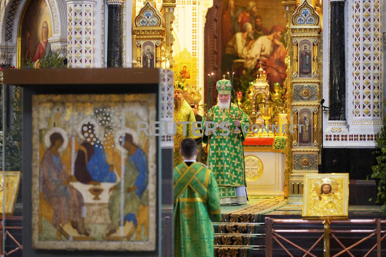 Την Κυριακή ο Πατριάρχης Κύριλλος, επικεφαλής της Ρωσικής Ορθόδοξης Εκκλησίας, χοροστάτησε σε λειτουργία στον Καθεδρικό Ναό του Σωτήρος Χριστού στη Μόσχα, έχοντας δίπλα του την εν λόγω εικόνα, την «Αγία Τριάδα», έργο του κορυφαίου αγιογράφου Αντρέι Ρουμπλιόφ.