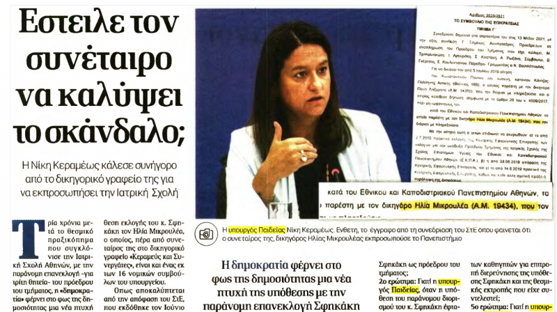Επισημαίνεται, τέλος, ότι ο δικηγόρος που αναφέρεται στο δημοσίευμα εκπροσωπεί το Εθνικό και Καποδιστριακό Πανεπιστήμιο Αθηνών από το 2009 (10 χρόνια πριν γίνει η Νίκη Κεραμέως υπουργός Παιδείας) και αυτό έπραξε, με την προσωπική του ιδιότητα, και στη συγκεκριμένη υπόθεση.