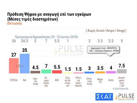 Προβάδισμα της Νέας Δημοκρατίας από 7,8 μονάδες έως 8,2 μονάδες έναντι του ΣΥΡΙΖΑ καταγράφει η νέα δημοσκόπηση της εταιρείας Pulse για λογαριασμό του ΣΚΑΪ