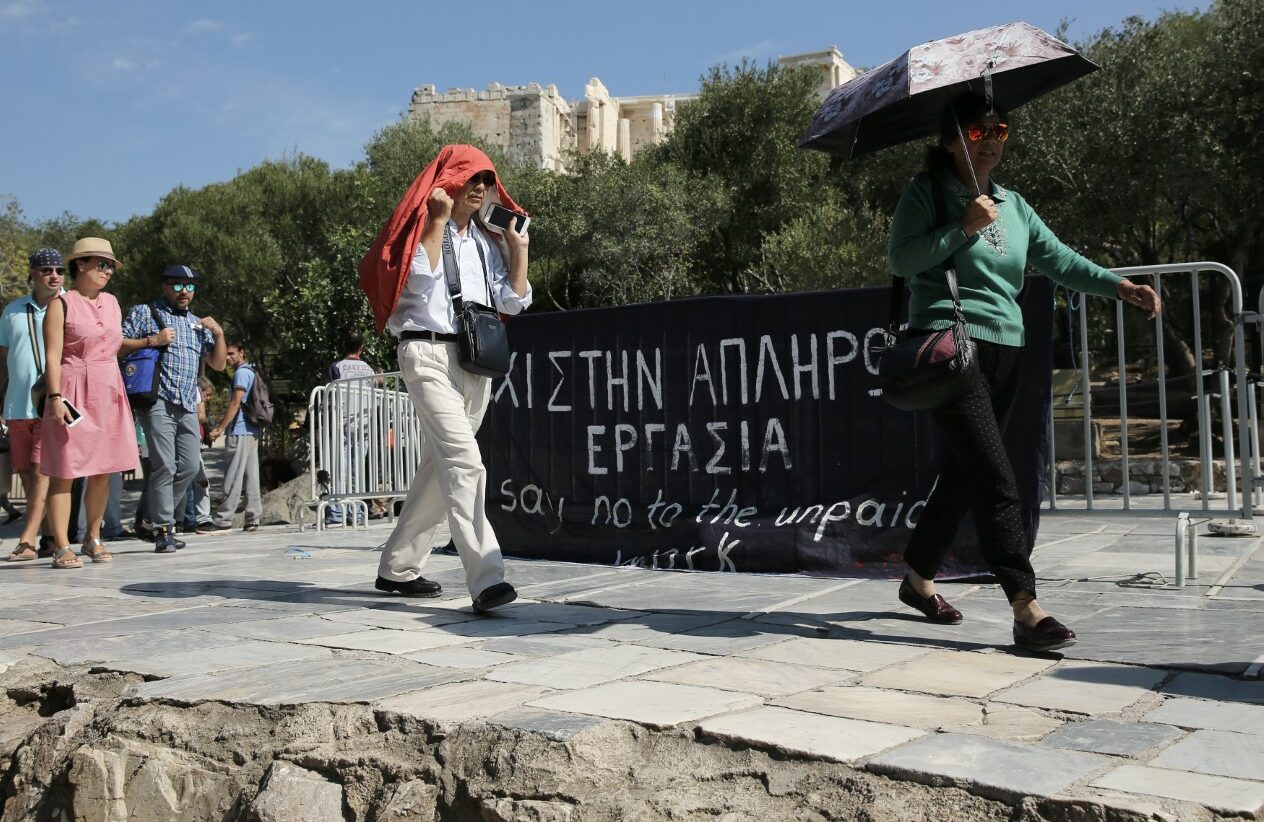 Σε συμβολικό αποκλεισμό της εισόδου της Ακρόπολης είχαν προχωρήσει εξάλλου και συμβασιούχοι του υπουργείου Πολιτισμού (φωτ. κάτω).