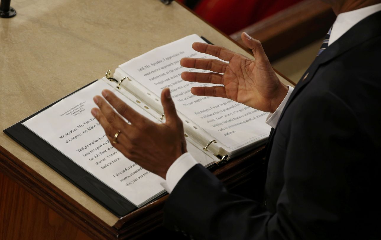 Παρότι υποσχέθηκε μια σύντομη ομιλία, και πάλι δεν κατάφερε να την περιορίσει σε λιγότερο από μία ώρα, «γιατί ξέρω ότι πολλοί θέλετε να φύγετε για την Αϊόβα» όπως εννοώντας τις προκριματικές που θα αρχίσουν από εκεί την 1η Φεβρουαρίου. Το αστείο έσπασε λίγο τον πάγο πριν ο πρόεδρος διατρέξει πολλά από τα κρίσιμα ανοιχτά θέματα για το 2016.