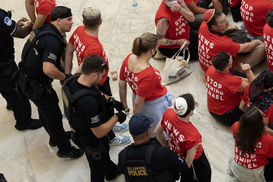 Η αστυνομία του Καπιτωλίου συνέλαβε ακτιβιστές που διαδήλωσαν εναντίον της στρατιωτικής βοήθειας των ΗΠΑ στο Ισραήλ μέσα σε κτίριο του Κογκρέσου την Τρίτη.