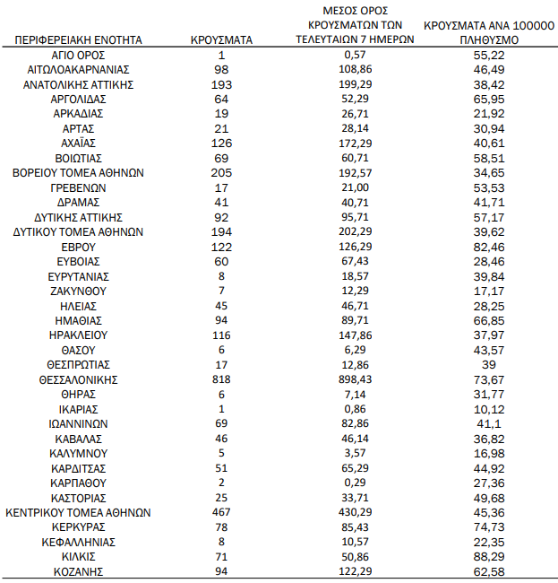 Με βάση τα επιβεβαιωμένα κρούσματα των τελευταίων 7 ημερών, 99 θεωρούνται σχετιζόμενα με ταξίδι από το εξωτερικό και 3.290 είναι σχετιζόμενα με ήδη γνωστό κρούσμα.